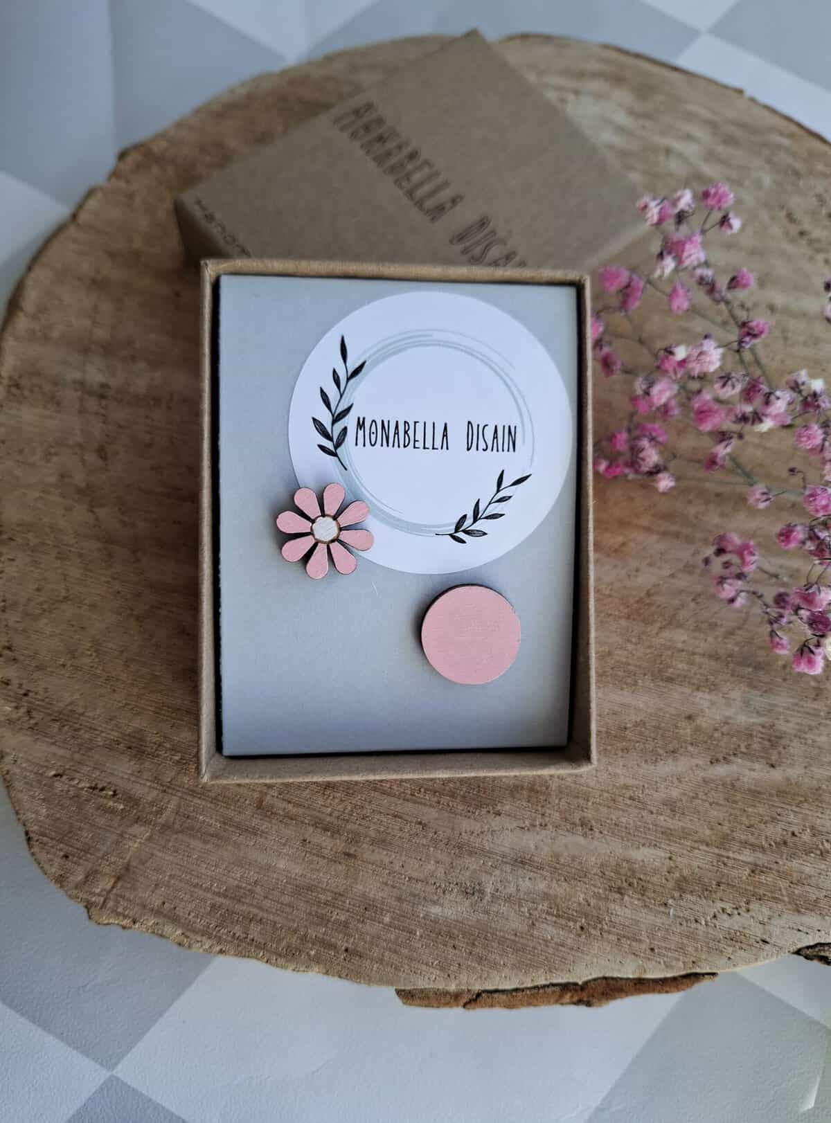 Mänguline disain – ühes kõrvas lill ja teises täpp. Valmistatud kasevineerist ja peale on maalitud käsitsi. Kõrvarõnga tagused on allergiavabast kirurgilisest terasest.