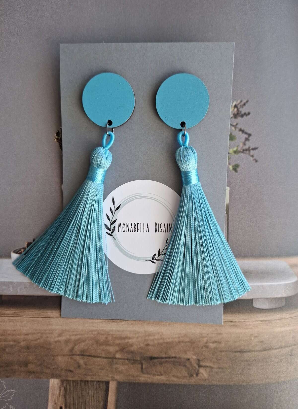 Efektsed siidist sabadega helesinised kõrvarõngad. Ringist osa on valmistatud kasevineerist ja käsitsi maalitud. Kerged, mugavad ja samas pilkupüüdvad. Kõrvarõnga tagused on allergiavabast kirurgilisest terasest. Kõrvarõnga pikkus on ~11 cm ja ringi laius ~2,5 cm.